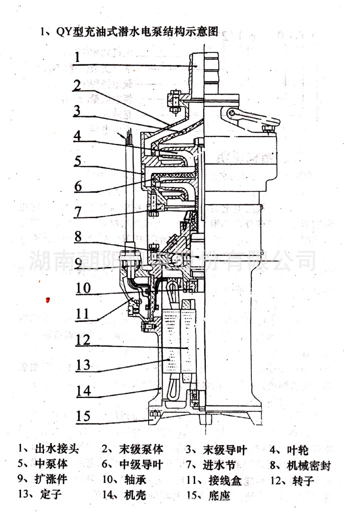 QY型潜水电泵由水泵、电机和密封三部分组成。