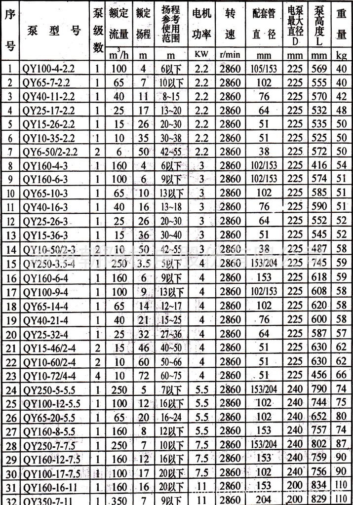 1、朝阳牌QY型普通矿用潜水电泵系充油式立式感应电机和不同材质的泵组成,上泵式结构,泵和电机连接部分同轴直接和连接器联接(三级以上多级泵)。对70米以上高扬程泵还配用减压逆止阀,确保泵在停机时的安全。该系列潜水电泵采用电子计算机进行优化设计,制造工艺精湛。其特点:泵和电机同轴直连,安全可靠,高效节能,安装简单,移动方便,是广大农村,工矿企业、城建和工程实施等给排水的理想设备,尤其适用于一般矿山井下排水。用户可根据适用条件选用合适的机型以及外配相应的手动综合启动器等保护装置。