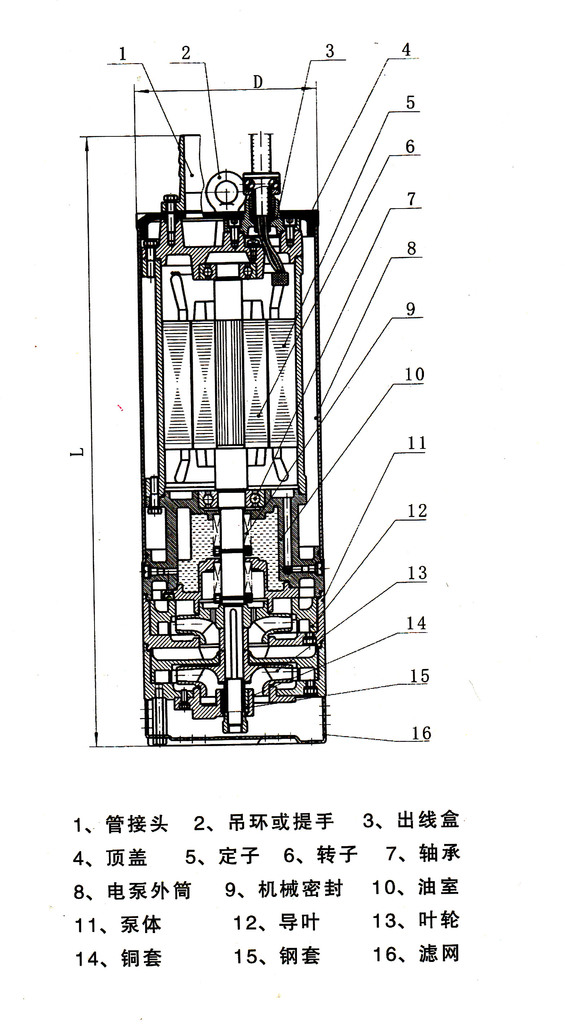 机、密封、水泵和电泵外筒四部分组成,水泵与电机同轴直联。