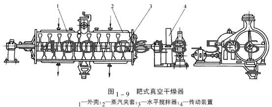 原理:被干燥物料从壳体上方正中间加入,在不断正反转动的耙齿的搅拌下,物料轴向来回走动,与壳体内壁接触的表面不断更新,受到蒸汽的间接加热,耙齿的均匀搅拌,粉碎棒的粉碎,使物料表面水分更有利的排出,气化的水分经干式除尘器、湿式除尘器、冷凝器,从真空泵出口处放空。