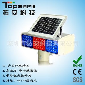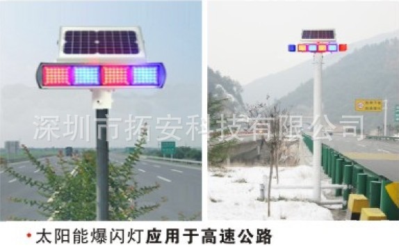 太阳能爆闪灯是一种安全警示灯,多用于保安亭、安保执勤点、匝道口、学校门口、交叉路口、转弯、多行人通过等存在安全隐患的危险路段或桥梁,起到警示作用。采用太阳能电池板对铅酸蓄电池充电,无需外接电源供电,发光单元采用台湾晶元芯片的高品质、高亮度LED,警示效果好。 |