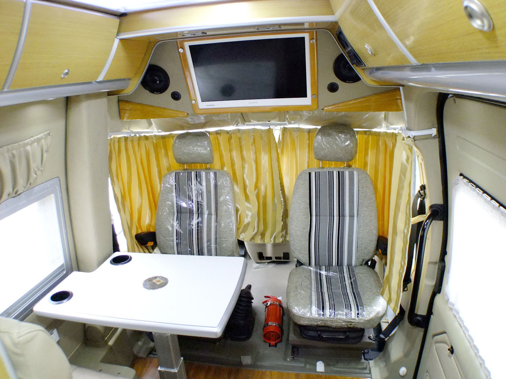 1、厢体局部加固并进行聚安酯发泡保温处理 2、专用手摇自卷式遮阳棚 3、重力/营地组合加水口 4、71L冰箱(12V) 5、3kw逆变器 6、音响系统 7、100Ah电瓶二个 8、22寸吸顶电视 9、豪华总控面板/电器集成板 10、外接电源插座 11、进口单眼灶 12、不锈钢无盖清洗盆 13、便携式坐便器 14、大换气扇(可双向排风) 15、卫浴小换气扇 | 16、90L净水箱,65L污水箱 17、豪华卫浴(一体式组合台面及卫浴淋浴装置) 18、纯净水箱总成25L 19、15米卷线盘一套 20、15米水管盘一套 21、12v微波炉 22、8L燃气热水器 23、豪华真空天窗(带自转式遮阳帘、纱窗) 24、旋转座椅2套 25、高档铝合金升降桌腿 26、5KG煤气瓶二个 27、整车窗帘 28、高档环保免漆家具:衣柜/厨柜/顶置吊柜 29、燃气报警器 |