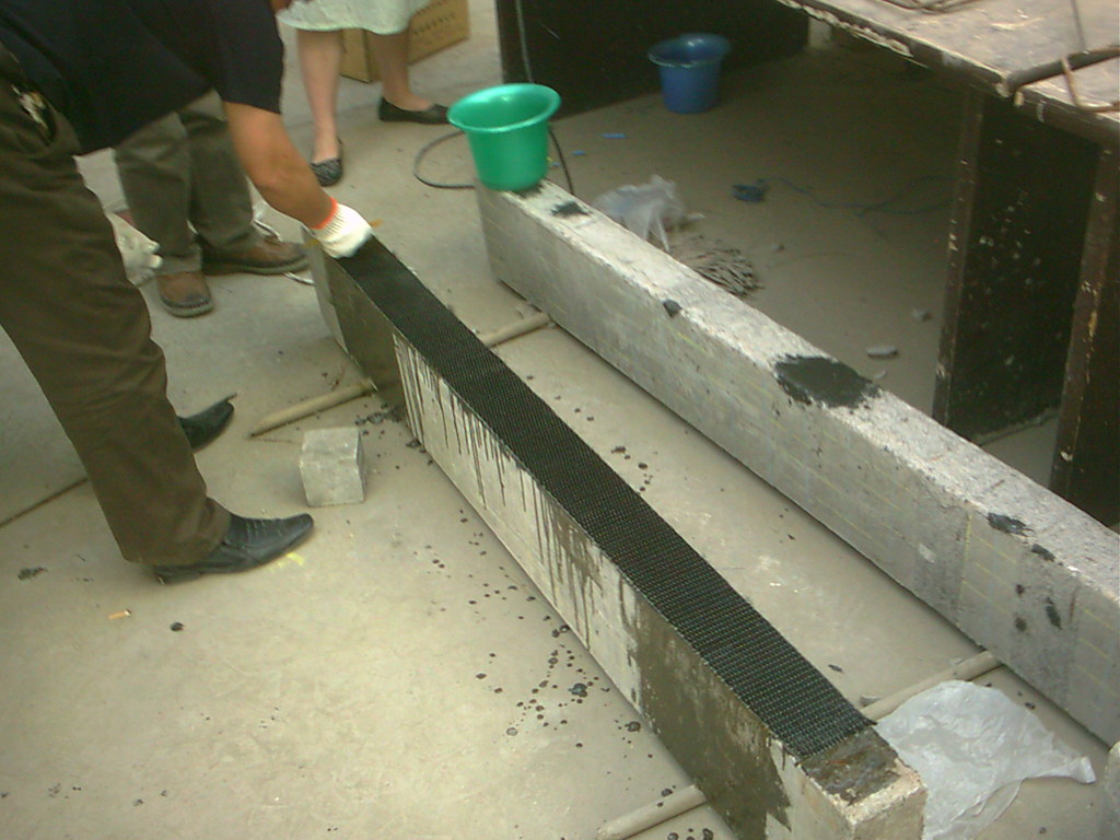 l 先按设计要求尺寸裁剪碳纤维织物,将它置于已涂抹胶粘剂的基层上。