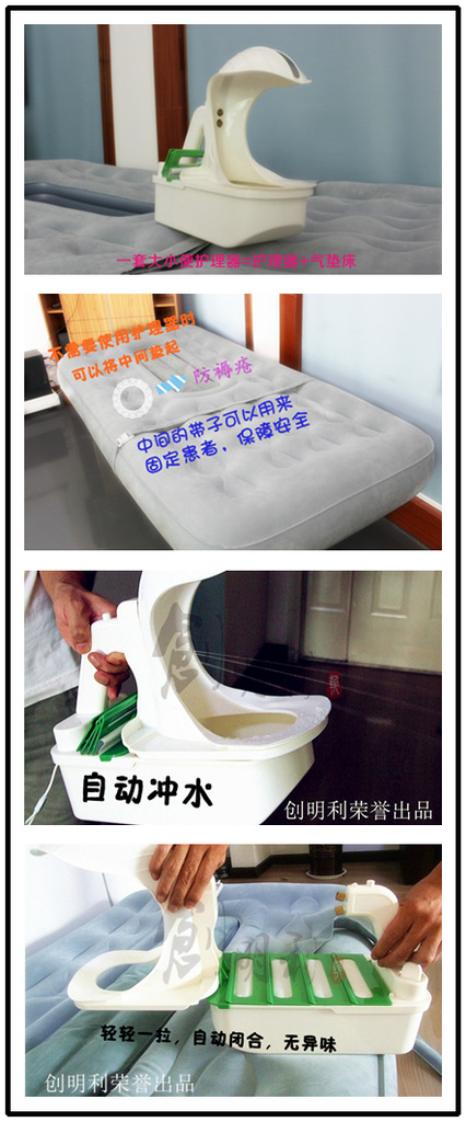 本产品拥有自动充气床垫以及带自动感应装置的主设备,的解决了不能自理人群躺在床上大小便的问题。产品已获得多项国家专利,在使用过程中具备看不到污物,且无异味溢出,不污染环境,便后自动电子感应报警、自动冲水等特点,完全解决长期卧床病人及手术后行动暂时不便病人在大小便护理方面的难题。