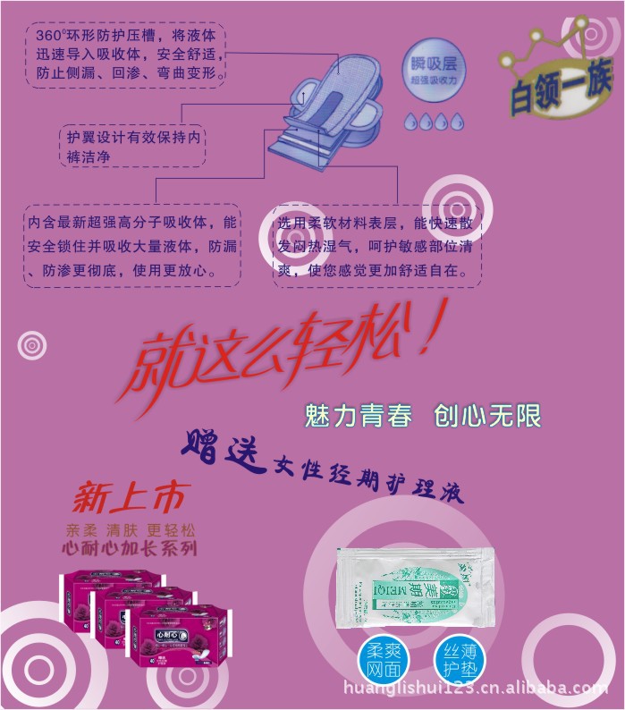 ③每包“白领一族”附带“女性经期护理液”一包;(该护理液是我公司与国内知名卫生用品“恒安”集团共同打造的一款护理液,让您的经期更安全,更健康)