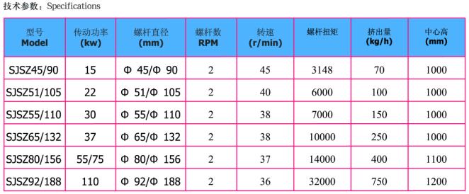 SJSZ系列锥形双螺杆挤出机具有塑化混炼均匀、产量高、质量稳定、适应范围广、使用寿命长、PVC粉料直接成型等特点。配以相应的成型机头模具和辅机,可将各种热塑性塑料特别是硬聚氯乙烯粉料,直接挤出成管、板、片、棒、膜及异型材等塑料制品,也可完成对各种塑料的改性及粉料造粒过程。