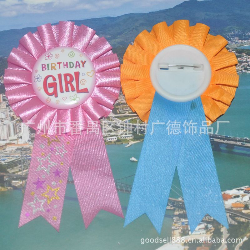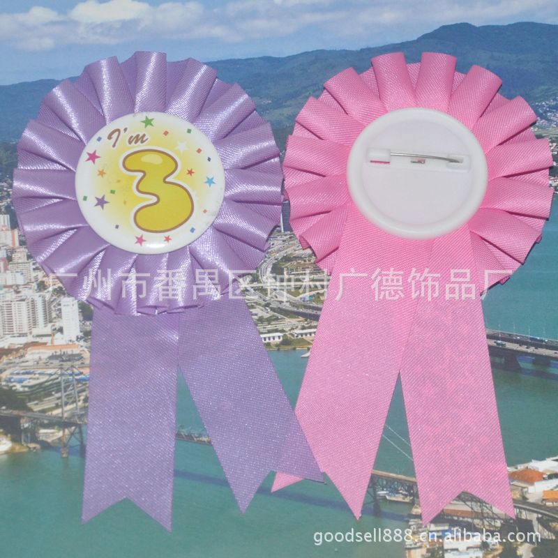 2)材质:铜板纸印刷+马口铁+塑料底+安全别针+丝带