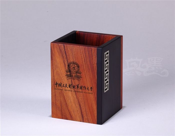 ”办公笔筒选用上乘紫光檀、非洲酸枝木、苗银加以风车纹,运用传统榫卯、刮毛、烫蜡、镶嵌等工艺精制而成。苗银柔和的白、紫光檀深沉的黑与非洲酸枝醇厚的红碰撞在一起,使器物厚重与明亮、静穆与活泼交相辉映,相得益彰。