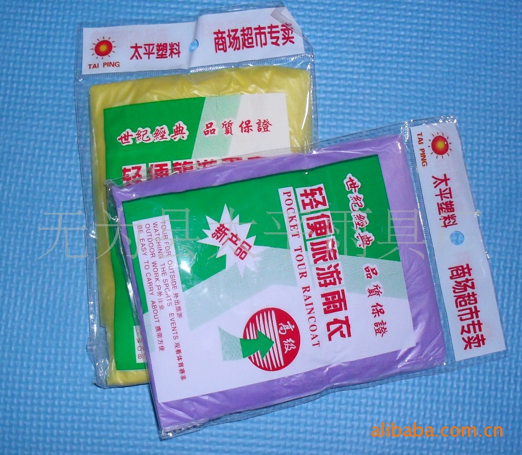 安徽省(无为县太平雨具厂):本公司自1997年建厂以来,引进国内外先进技术,不断对产品进行开发和改进,一直为世界各国客户提供高品质的产品及服务,产品完成到代办发货均是一条龙完成,确保产品质量,也降低了产品成本 ,本厂技术力量雄厚,生产周期短,交货准时,重信誉。产品远销亚洲、非洲、欧洲.、南美洲等国家和地区。在国际上有着很好的声益,本厂一直兼任顾客为第一,薄利多销,不断加大生产能量,广泛招收员工,紧抓质量,以历史悠久,诚信的服务和拥有完整、科学的质量管理体系,获得广大客户的长期信赖与合作。各种一次性雨衣携带方便、价格低廉,既经济又实惠。可根据客户要求定做等等,既方便使用又可为企业及产品做宣传,是雨季最实用的广告宣传载体。颜色、规格多样可选。是旅游,户外大型活动、节日庆典、产品促销等必备产品,其次产品物美价廉,品种齐全,用于各种游乐场,漂流,登山,户外作业,参观赛事,水上活动,商场超市,矿山建筑,渔业农用等多种场合。 主要产品有高中档雨衣,PE一次性雨衣,,EVA一次性雨衣,帽代袖口一次性雨衣,塑料四合扣一次性雨衣,真丝四合扣雨衣,真丝套头雨衣,各种新料一次性雨衣,加大加宽一次性雨衣,PVC磨砂雨衣,一次性套装雨衣,一次性鞋套等,PVC牛筋雨衣,PVC牛筋套装雨衣,海胶雨衣雨披等等。。 本厂拥有一大批各类优秀人才、国内外领先的技术、先进的检测仪器及手段、精良的生产设备及完善的管理体系,竭诚为广大新老客户提供一流的产品及优质的服务,欢迎广大新老客户莅临本厂参观、洽 谈!(1)各种材质套头式雨衣:每款包装简单大方,使用方便,款式多变,帽子有绳子,袖口有皮筋,有的没有。雨衣有薄有厚,纯属一次性雨衣,价格低,包装简单,携带方便。加厚雨衣可以重复使用,价格不等。雨衣都独立包装,有的有彩卡,有的是彩色印刷包装袋,大货每袋装1000件箱装600件等等。 (2)各种材质开衫纽扣式雨衣:每种开衫纽扣雨衣都是有(四粒塑料纽扣),使用方便,有加大加厚型,每件是独立小包装,包装内付有彩卡,大货袋装500件箱装300件,材质有塑料,新料,真丝磨砂还有非一次性纽扣雨衣。有很多可以重复使用,也有高档式的包装。 (3)各种材质套装雨衣:套装雨衣就是分体雨衣,有上衣和裤子,每件都有独立包装,有一次性和非一次性的,一次性的也可以穿好几次,非一次性的就是长久性的。 (4)各种材质鞋套:鞋套有皮筋的,有薄有厚。也有靴套,带皮筋系在小腿上。每款都有独立包装,防污防尘防水,适用于各种场合,如医院,宾馆,商场超市,家庭,漂流河激流勇进等,使用方变简洁。 (1)以上雨衣男女兼用,用于各种场合,携带方便,多色可选。出口货物均可装箱,雨衣由各种PE、eva.PVC等等面料制作,都采用最新技术生产设备,缝接处防水防漏,无毒无味,超级环保。面料柔软,遇寒冷不变质,不粘水,干爽舒适,防水性强。 (2)本公司产品都有各种尺寸型号可供客户选择,质量好点的用后请透风处晾干,不要暴晒太久,再折叠可以用很久。 (3)本产品支持支付宝交易,可以混批,大货根据买家要求来安排发货,有意者请最好提前联系订购,产品质量都是经过检查,请放心采购! (4)本厂所有产品图片均为实物实拍,所有图片都是一位模特所拍,模特身高为1.7米,请有意者仔细观察所有产品的长度,厚度 ,款式等来选购自己满意的产品!