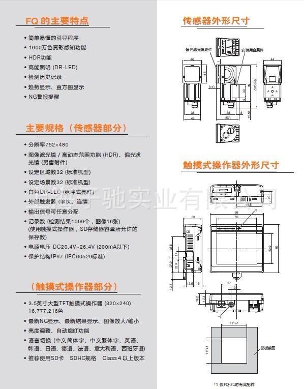 | |  | | | 视觉传感器 | | | 中文界面八国语言对应 • 简单易懂的引导程序 • 1600万色真彩 • HDR功能 • 高能照明(DR-LED) • 检查历史记录 • 趋势显示、直方图显示 • NG警报提醒 |