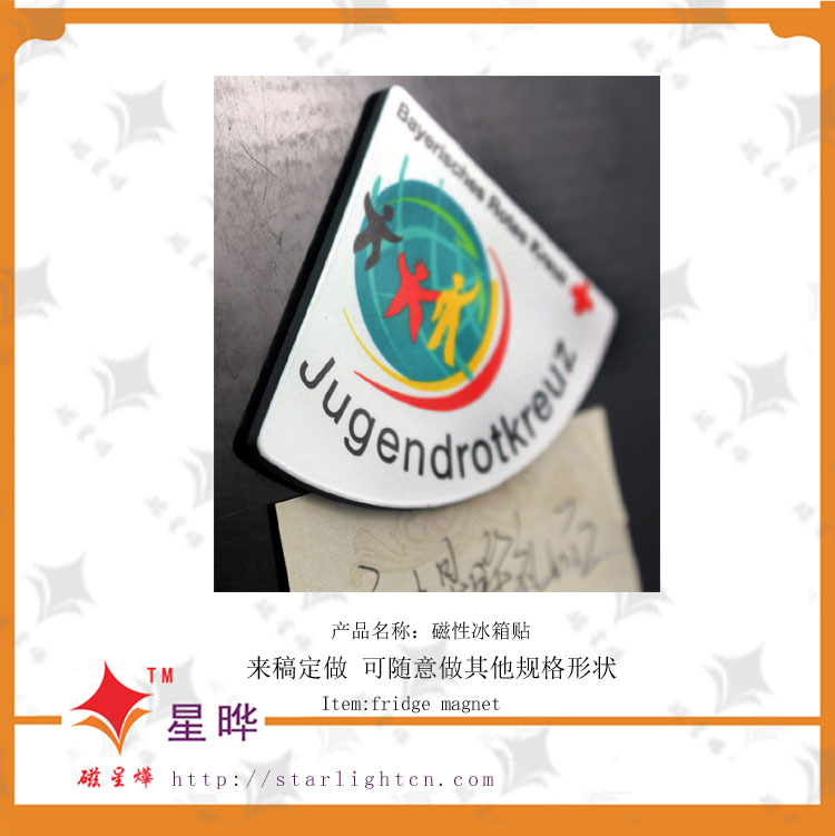 本产品采用磁性材料裱铜版纸彩色印刷腹膜制作而成,色彩丰富,使用寿命长,移动方便,自由组合,避免了粘贴胶质遗留痕迹的问题,可贴于冰箱贴等任何金属平面物体外表。使用范围广,是商务促销的最佳选择。