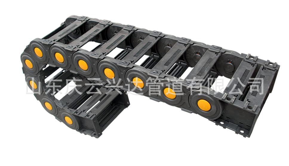 (3)单元链节由左右链板和上下盖板组成,拖链每节都能打开,装拆方便,不必穿线,打开盖板后即可把电缆、油管、气管、水管等放入拖链。