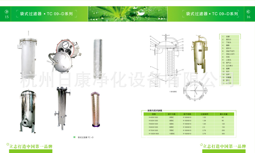 编辑本段袋式过滤器规格: 袋式过滤机分为:单袋式过滤机、多袋式过滤机和夹层型过滤机。多袋式过滤机,适用于大流量过滤。从2装袋到24袋装,规格齐全,进出口法兰口径为φ50—450MM,单机最大流量90-1000m3/h.。可提供快开设计,滤袋更换非常便捷。也适用于希望适用较长时间后方才更换滤袋的场合。多袋式过滤器因体积较大,顶盖重量重,一个工人难以操作,在此过滤器加上摇臂装置,可降低人工成本,满足客户的要求。