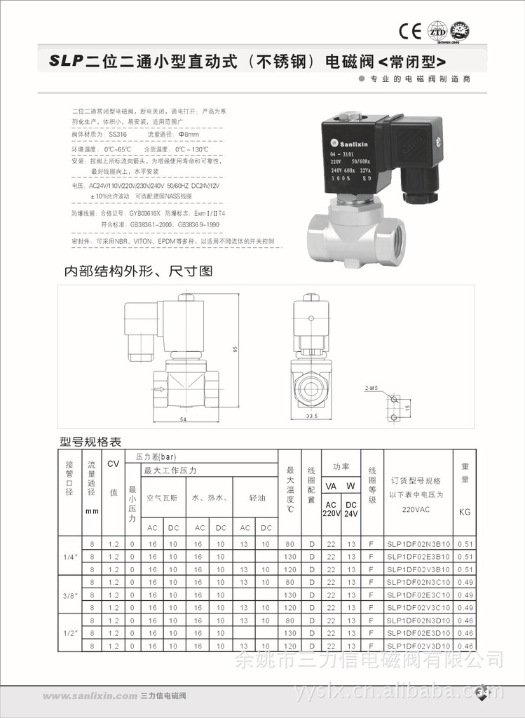 SLP二位二通小型直动式(不锈钢)电磁阀 常闭型