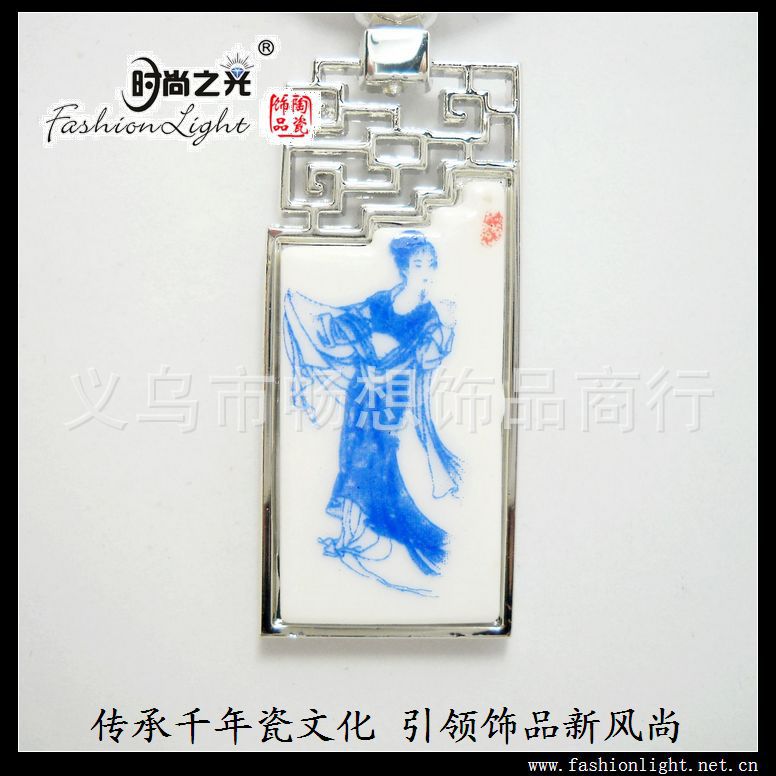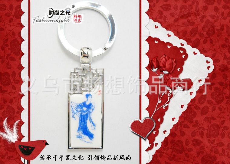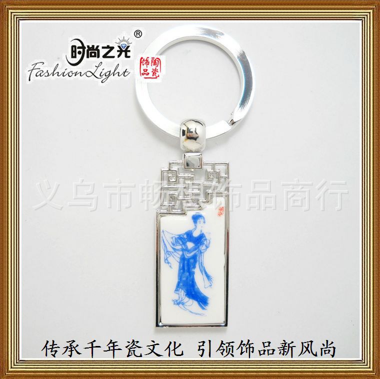 [厂家直销]时尚之光陶瓷饰品青花瓷仕女金属钥匙扣 (4.5*2CM)