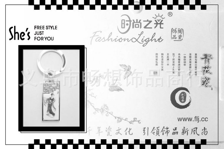 一.关于时尚之光 时尚之光是年轻的饰品品牌,秉承"传承千年瓷文化,引领饰品新风尚"为理念。此品牌的持有者义乌市畅想饰品商行立足世界小商品之都,拥有专业的产品研发设计团队和完善的加工生产线,经营产品总类丰富,涵盖青花瓷系列,粉彩瓷系列,喷彩描金系列,青花描金系列,车挂系列,钥匙扣系列,书签系列,化妆镜系列,产品极具创意,是传统瓷文化和现代时尚元素的完美融合。个性张扬的你,还在等什么?FASHION LIGHT WITH YOU! 二.产品细节及包装图