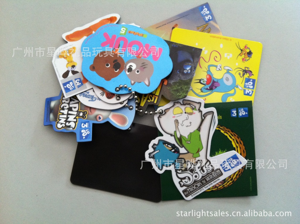 1)磁性冰箱贴:采用下面软胶磁铁+上面铜版纸彩色印刷腹膜制作而成。