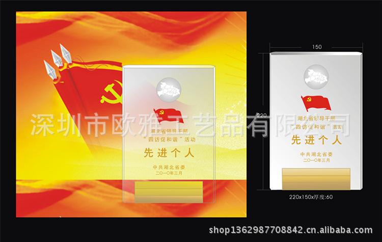 深圳市欧雅公司工艺品有限公司创建者前身是深圳市卓尔工艺品制造厂,成立于2004年.公司主要产品有水晶奖杯奖牌系列,水晶模型系列,水晶饰品艺术品系列,酒店用品系列,商务会务用品系列,琉璃精品系列,奖牌标牌系列,金属奖杯系列,金属工艺品系列,证书旗帜徽章系列等工艺品。 公司拥有完整、科学的质量管理体系,专业的研发设计团队,专业的生产工厂和先进的机器设备,主要面向全国各地个体,企事业团体客户,机关单位,政府单位及港澳台和部分东南亚国家。 我公司以雄厚的实力、合理的价格、优质的品质,精湛的艺术和优良的服务与多家企事业单位,政府单位建立了长期的合作关系,也期待与您携手共进,互惠互利,共赢天下!