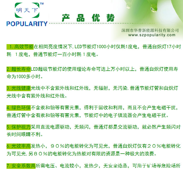 6. 灯具重量轻,易安装。环保、安全、无污染,符合RoHs规范