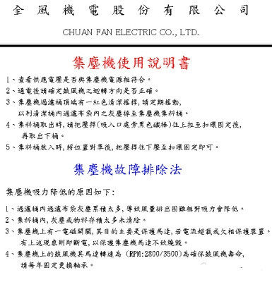 1。 本吸尘机为本公司最新制造,采用旋风收尘机与袋式吸尘机之特长,吸力特强。
