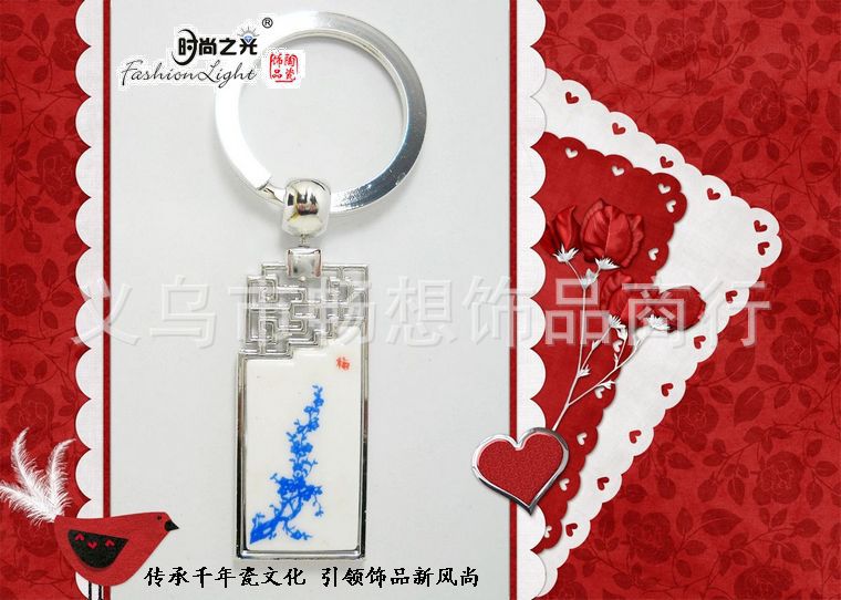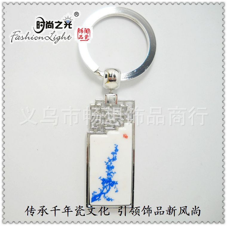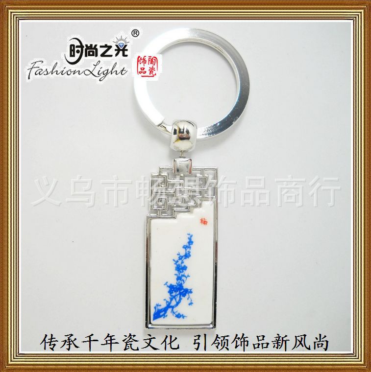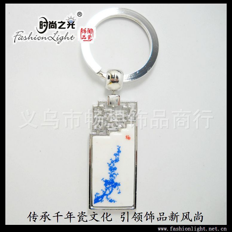 [小额批发]时尚之光陶瓷饰品 青花瓷 梅花金属钥匙扣(4.5*2CM)