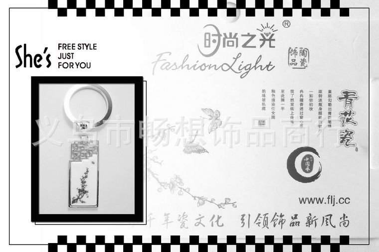 一.关于时尚之光 时尚之光是年轻的饰品品牌,秉承"传承千年瓷文化,引领饰品新风尚"为理念。此品牌的持有者义乌市畅想饰品商行立足世界小商品之都,拥有专业的产品研发设计团队和完善的加工生产线,经营产品总类丰富,涵盖青花瓷系列,粉彩瓷系列,喷彩描金系列,青花描金系列,车挂系列,钥匙扣系列,书签系列,化妆镜系列,产品极具创意,是传统瓷文化和现代时尚元素的完美融合。个性张扬的你,还在等什么?FASHION LIGHT WITH YOU! 二.产品细节及包装图