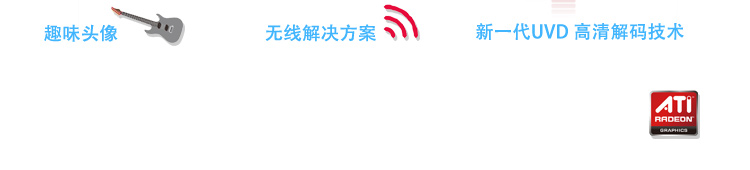 源自数码相机的人像自动识别技术,可以对面部动作进行智能识别,配合头像模拟功能,可以创造惟妙惟肖的意趣头像,增添网聊乐趣。 最新802.11b/g/n无线技术,网速达到300Mbps,是上一代的6 倍( 与特定型号的无线收发器配 合使用)。 ATI 新一代10bit 色彩处理技术,实现平滑色彩过渡,让高清大片播放流畅自然,完美还原栩栩如生的视觉效果。 |