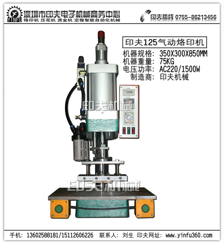 深圳市印夫电子机械设备公司成立于2004年,是一家集技术研发、机械制造、销售维护为一体的综合性企业。公司依托自有的研发中心和深圳生产基地的优势,自2005年开发出国内首台手持式烙印机并投入市场至今,已陆续向市场推出手持式烙印机系列、台式烙印机系列、气动增压烙印机系列、自动滚压烙印机系列、全自动烙印机系列、智能自动化烙印机系列、自动对位烙印机、全自动木叉勺机、木托盘自动生产线、轮胎雕花机、橡胶开槽机、丝印机、数控打码机、自动化检测设备等40多种机型。并可根据客户需求提供专业的非标自动化组装机械开发定制。其产品广泛应用于木材、皮革、塑料、橡胶、纸张等行业。 作为中国首家烙印机专业制造商,印夫公司在烙印机行业的推广应用、技术创新、营销服务方面具备卓越的标杆影响力。 印夫致力于开发定制最可靠的、高效易用的非标自动化组装机械,以最底的总体成本,换来更高的生产效率。公司本着“以诚兴业、以新致胜”的经营理念,助力企业成功,互惠共赢。 印夫公司下设工艺品制造部,本部拥有多台先进的机械加工设备,从业多年的专业技术人员,常年对外承接各种精美的木吊牌、木明信片、木杯垫、木镜、木贺卡、木钥匙扣、木台历、木广告牌、木标牌、木板画、皮标牌等产品的加工业务,量大从优、保质保量,欢迎来电咨询,实地考察。 手机:13602588181/15112606226 电话:0755-86213456/29453500 联系人:刘生