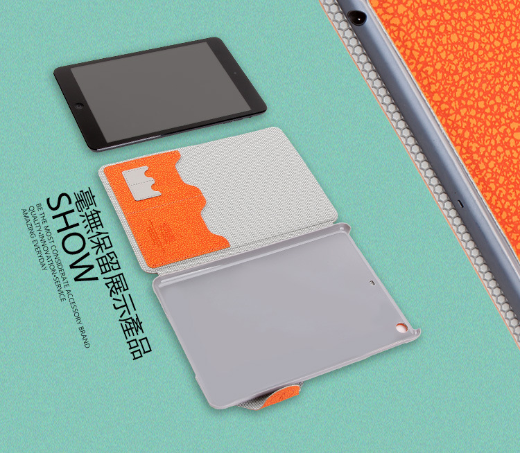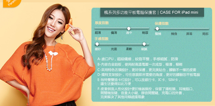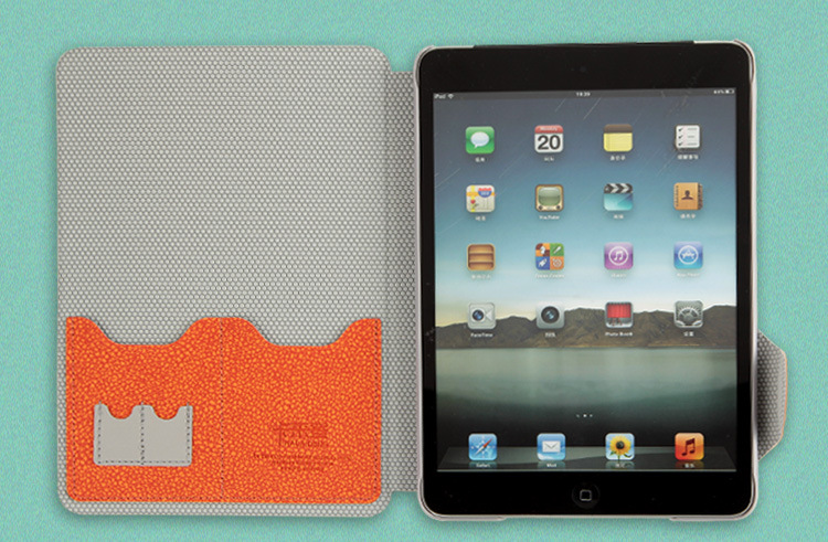 【产品特点】1、进口PU,手感细腻,防滑;2、内镶合金铝块,使用耐高温电压一次成型,极薄极轻;3、采用特色舌头设计,让您的ipad mini得到更好保护,更完美贴合;4、独特支架,任意调节;5、独特插卡设计。