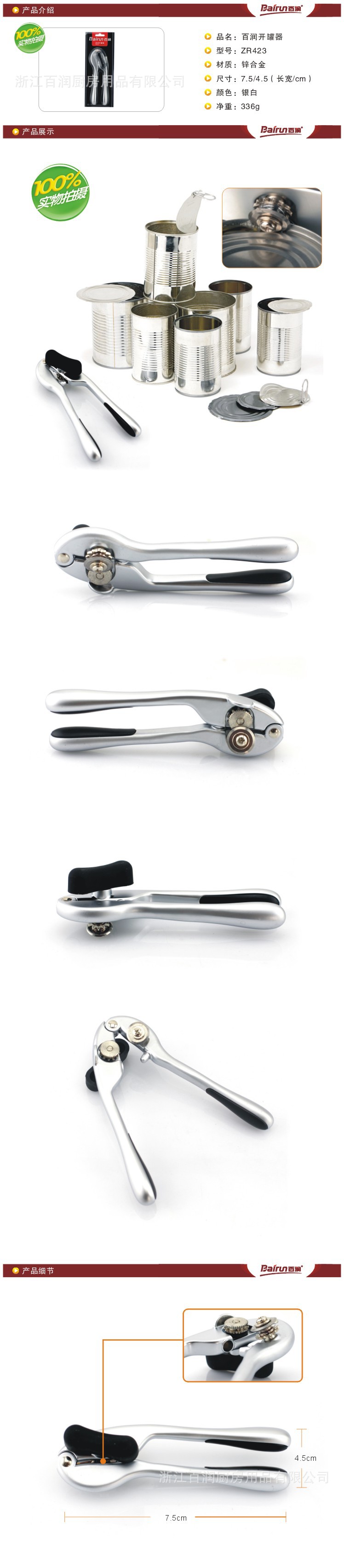 百润开罐器选用高档锌合金原料压铸而成,表面电镀处理。耐用。