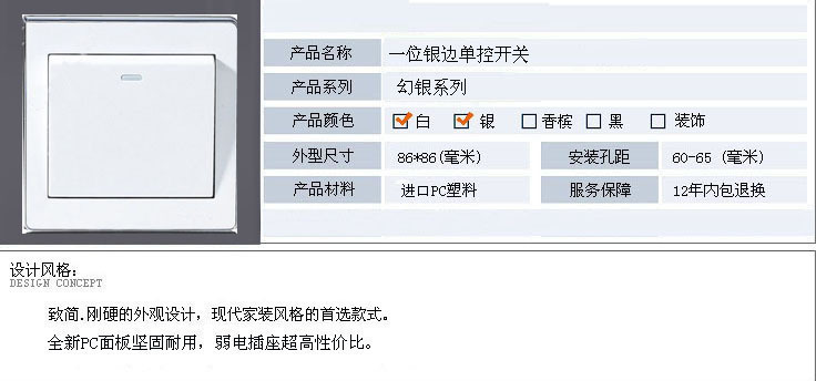 国际质量体系运作。现在已形成了从原材料进厂到成品出库一条龙的科学、全面、完善 的品质控制体系。公司注重引进和采用国际尖端的科技和设备,依靠科学管理应用新材 料、新工艺、积极投入并研制各种款式新颖、结构别致、性能安全的新产品。现已成为 中国电工行业的典范,在中国建筑电气领域享有盛誉。其卓越的产品性能,精美的装饰效 果,取得了众目睽睽的成就。赢得了国内外广大消费者的青睐。 主要产品有:墙壁开关、插座、排插、断路器、地插、酒店插座等中高档产品,是