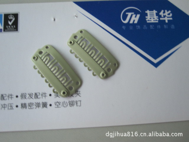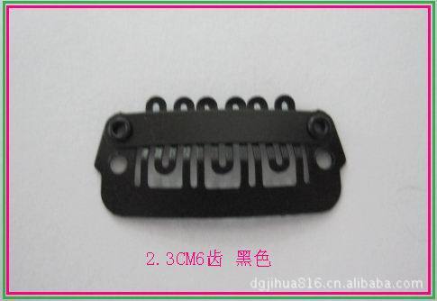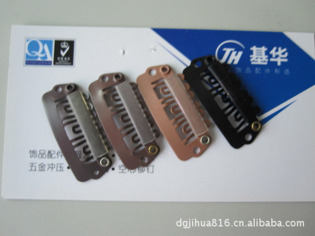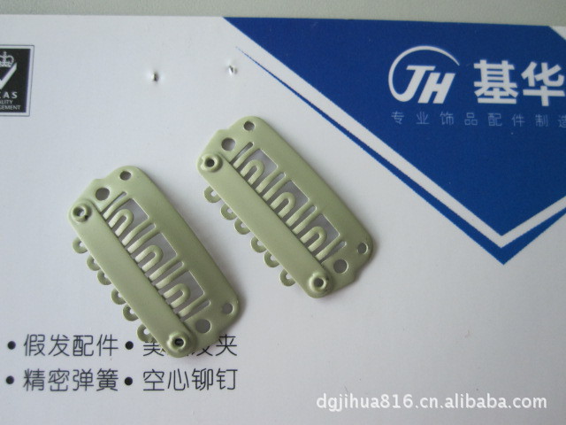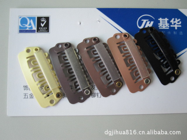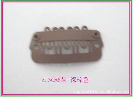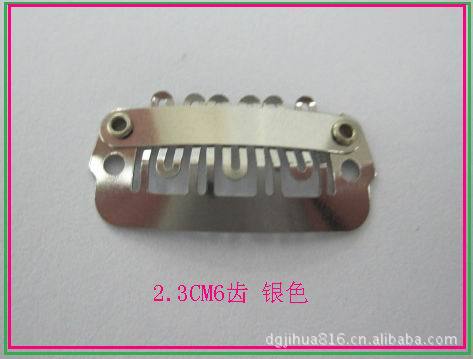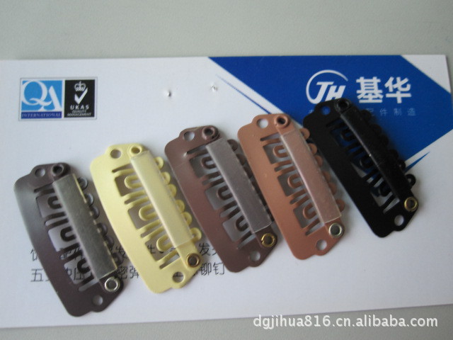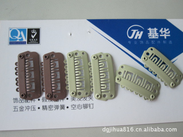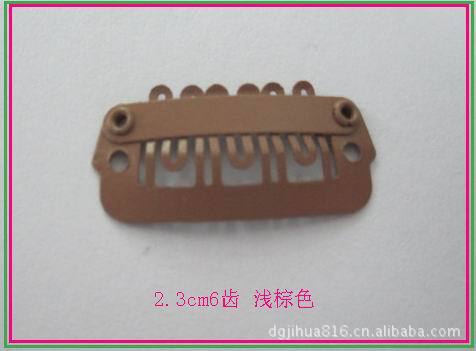公司以“质量保证、交期准确、价格合理、服务到位”的经营理念和“客户至上、信誉第一、追求卓越”为质量指导方针。真诚欢迎国内外各界朋友光临惠顾,竭诚合作,共创辉煌! 我司专业生产假发接发卡子,接发夹,啪啪夹,采用优质进口不锈钢和国产碳钢材料生产。有直齿和回形齿,有2.3cm6齿/7齿,2.8cm6齿/8齿,3.2cm6齿/9齿,3.4cm10齿,3.8cm10齿。通用颜色有1#黑色,2#深棕,3#棕色,4#浅棕,5#米白,6#银色,7#肉色,8#米色。可以按贵司样品颜色生产,希望我们的接发卡子给您的假发产品增添别致的风格。