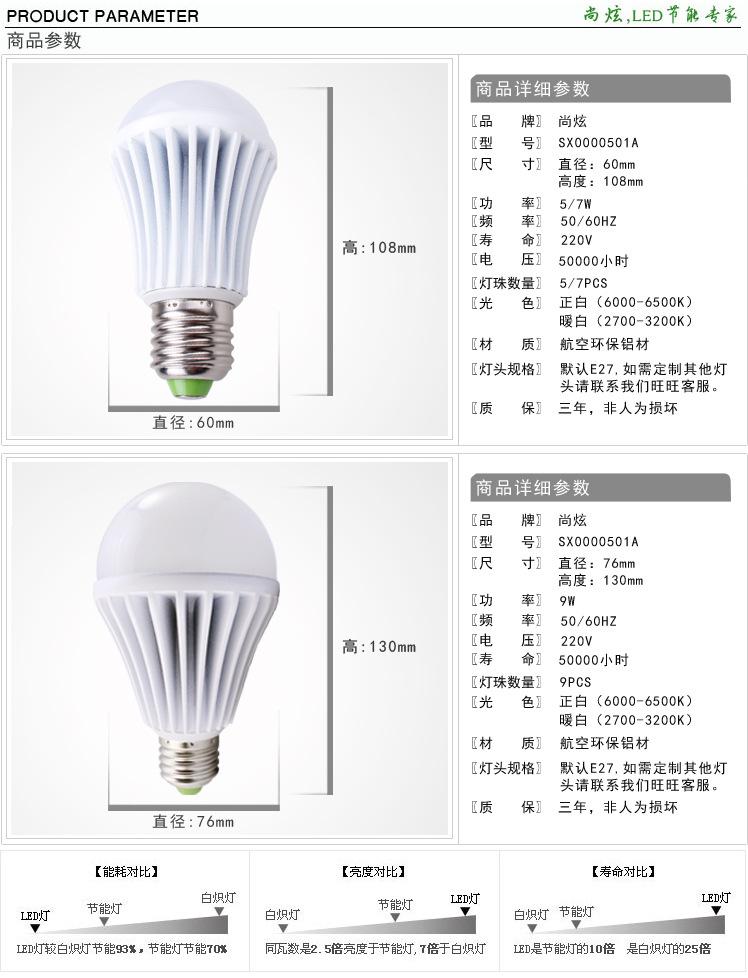 所售灯泡100%无暗区,170度发光,无光斑无暗区,独有的封装技术,高透光率高达90%,超长寿命50000h.