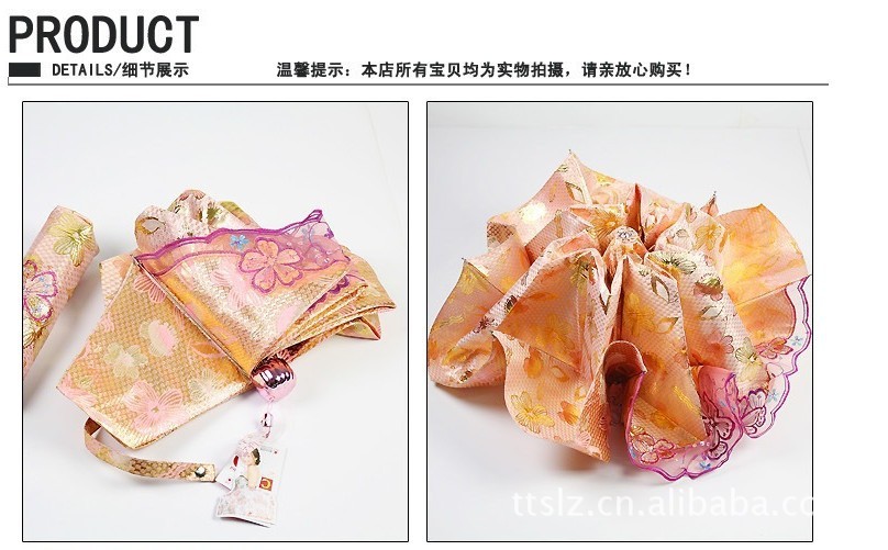品 牌 红叶伞 功 能 遮阳/抗风类 型 三折遮阳伞 关合长度 约22CM重 量 约320克 防晒指数 UPF>50+, UVA<5% 超强防紫外线伞下直径 约90cm 支架材料 钢骨架伞撑数量 7根 抗风性能 4-6级颜 色 3种 产 地 浙江特点 此伞采用时尚金属丝和100%涤纶加防晒涂层(金属丝反射紫外线及物理吸收功能超强,有隔热和降温效果,涤沦又被公认为防紫外线最佳面料)的混纺面料配合俏皮的金色花图案,让这只伞不用过多的设计就可以很漂亮了,尤其是价格上超乎想像的实惠。