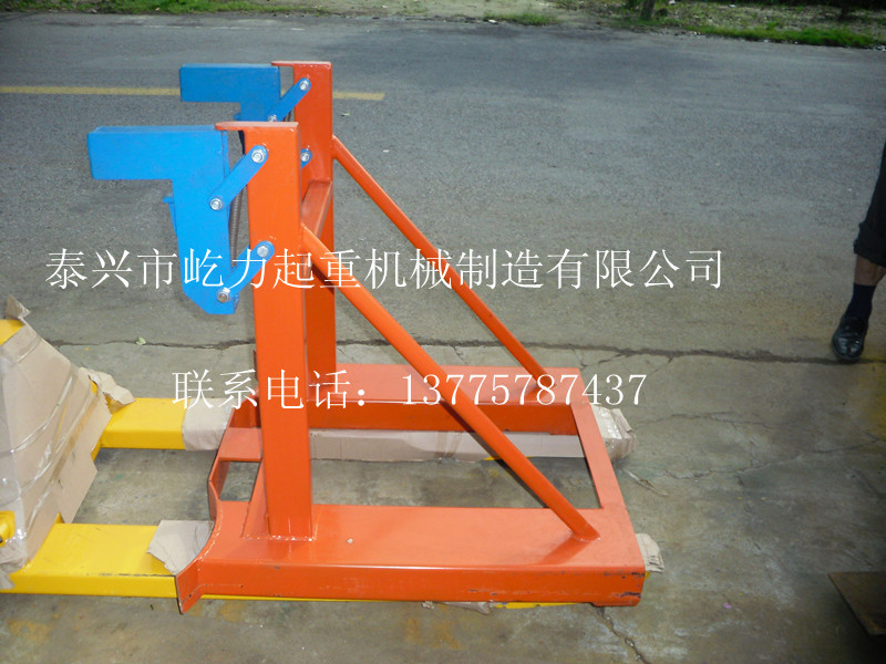 圆桶、油桶搬运车的油桶夹纯机械结构设计的重型双桶夹具可与叉车方便地配合,仅依靠叉车的动作,不需要其它动力,可自动一次搬运1-2个桶。