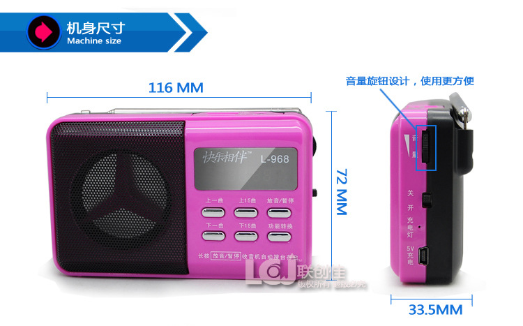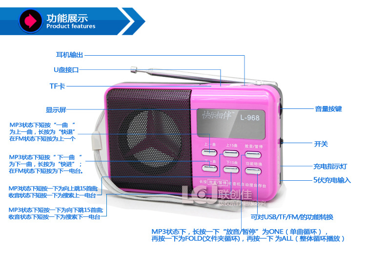 7、带曲目循环功能,MP3播放状态下,长按一下为ONE(为单曲循环),再长按一下为FOLD(文件夹循环播放),再长按一下为ALL(整体循环播放)