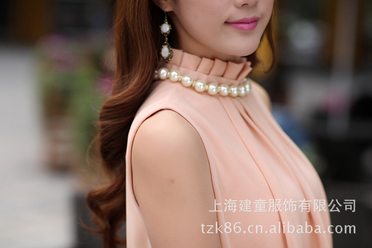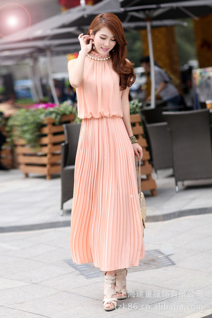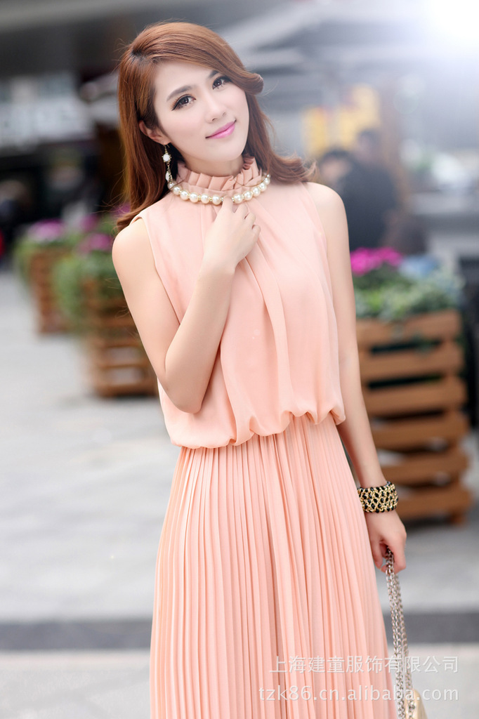 批发酷比兔K3916 夏装新款女中长裙 韩版显瘦无袖百褶雪纺连衣裙
