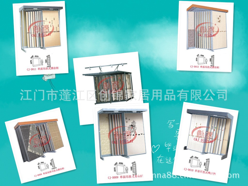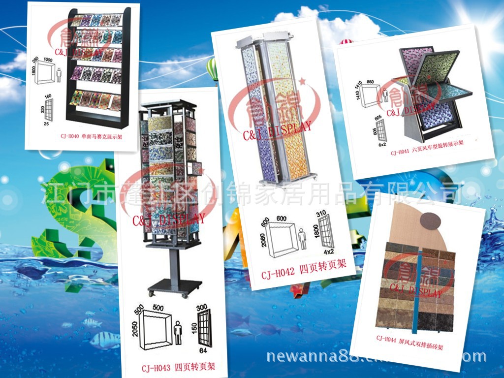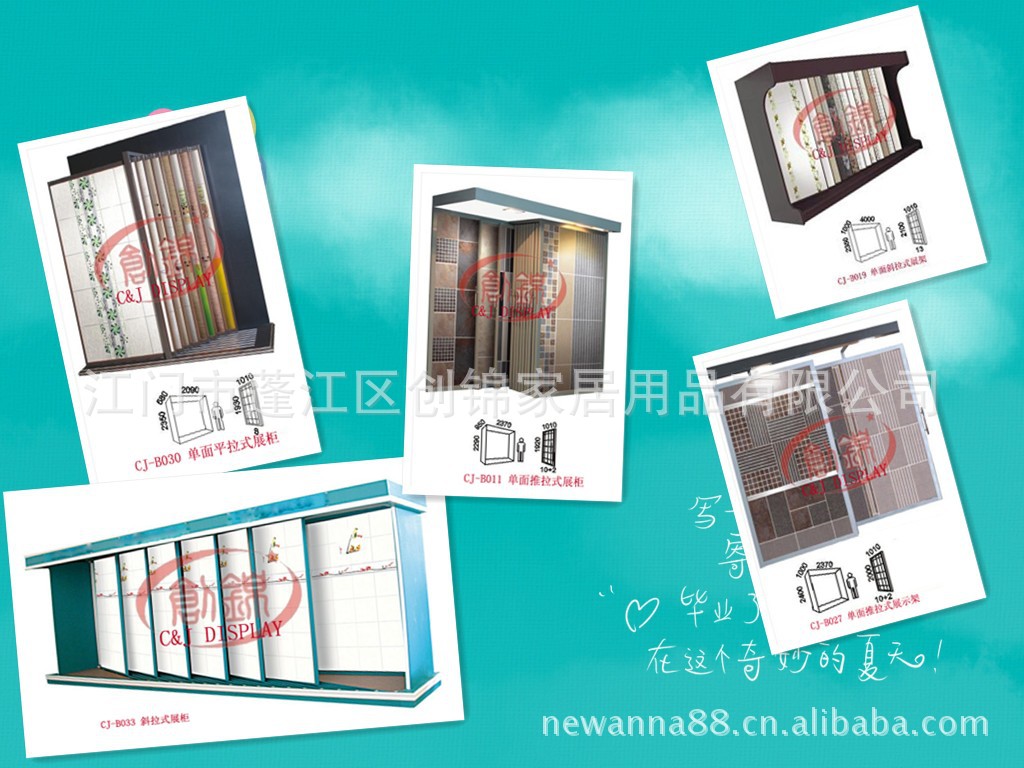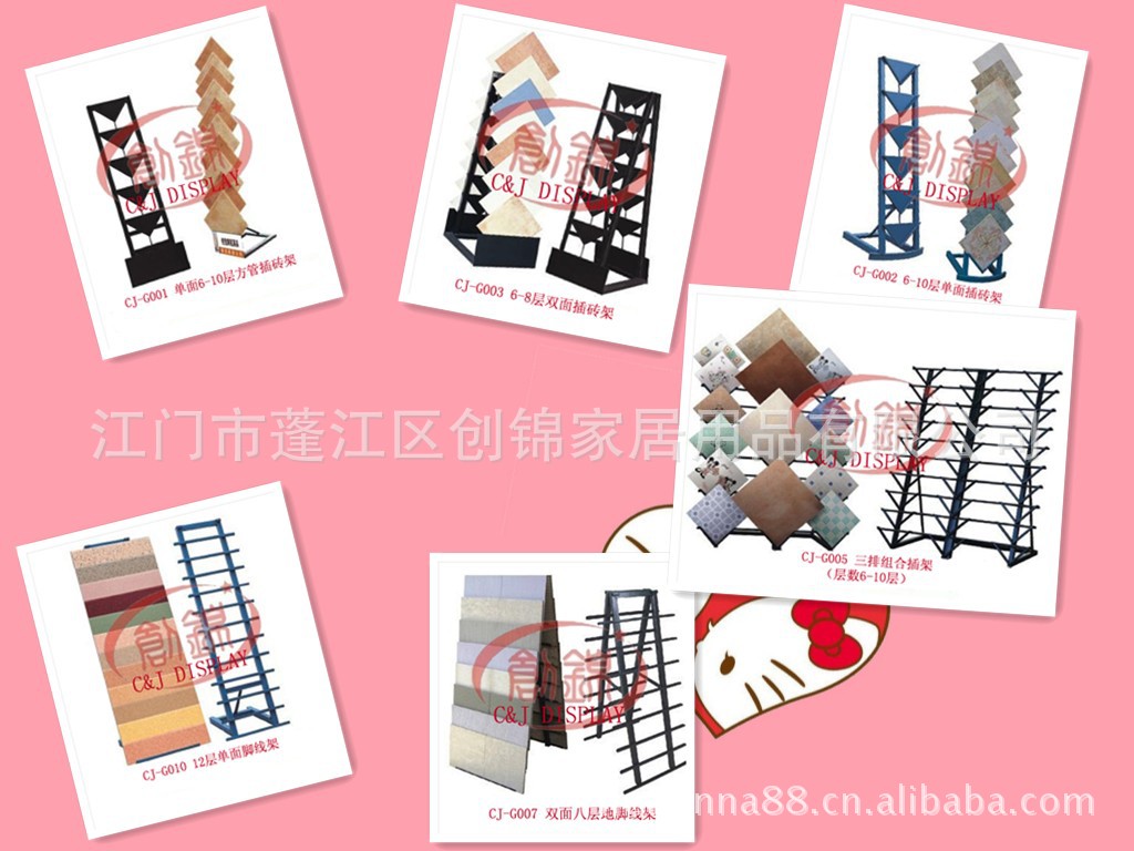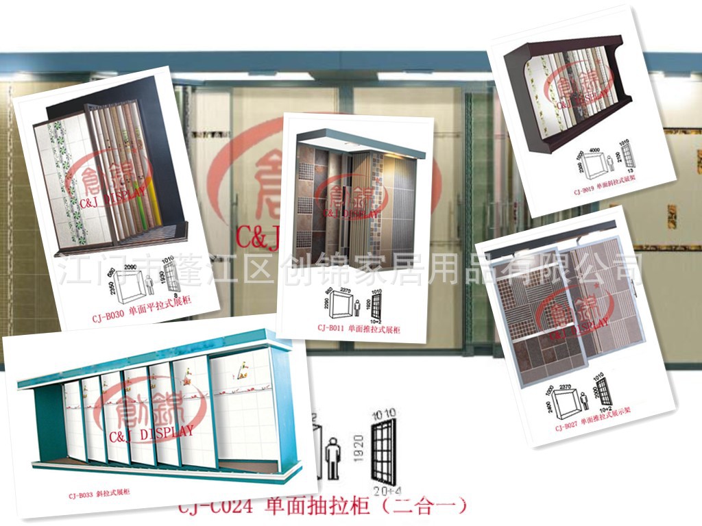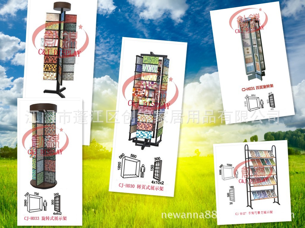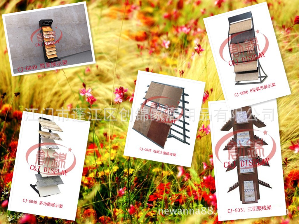 创锦展具主营生产的展架有:瓷砖展示架、地砖展示架、墙砖展示架、马赛克展示架、艺术玻璃展示架、大理石展示架、洁具展示架、天花展示架、地板展示架及资料展示架等等。可按客户的要求及尺寸量身订做特殊展具。展架质量优良,设计新颖、独特、结实耐用,供货准时,可根据您需要的尺寸订制,也可选择您喜爱的颜色。