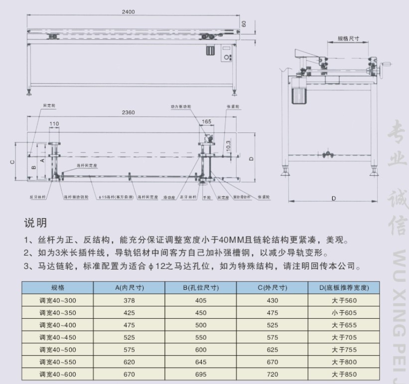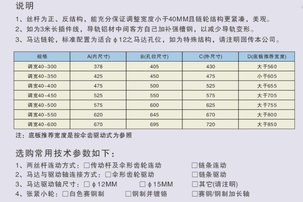 插件线调整座一般有几种规格:调宽40-300;调宽40-350;调宽40-400;调宽40-450;调宽40-500;调宽40-550;调宽40-600MM。