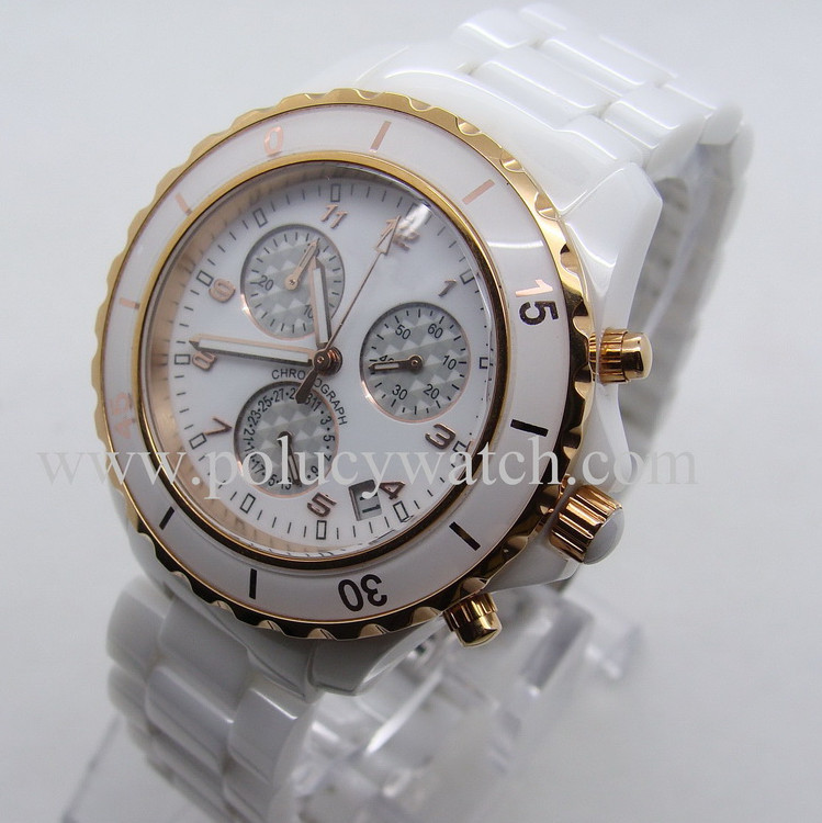 表壳:圆形白色陶瓷表壳,金色壳圈,尺寸为41*50mm