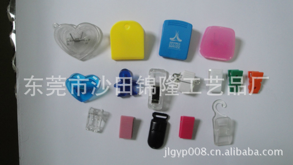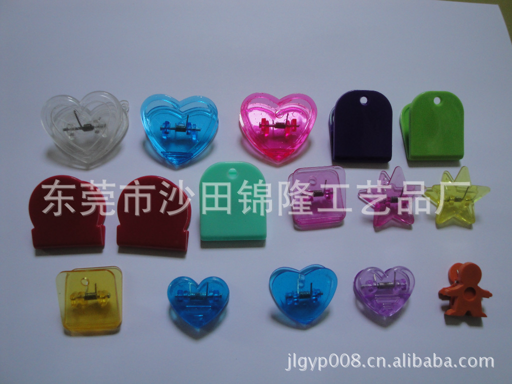 供应各种各样的夹子、塑料吊夹、塑料夹子、翻盖夹、胶水夹、吊扣、鸭嘴夹.夹子固定性强,可牢固的夹住衣物等物品,同时也可配上胸针一起使用,外形美观轻巧,可随意开启,方便实用!