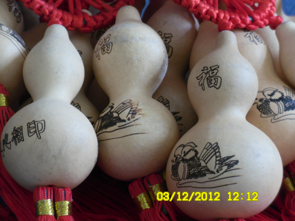 葫芦是中华民族最原始的吉祥物之一,人们常挂在门口用来避邪、招宝。上至百岁老翁,下至孩童,见之无不喜爱。就连电视剧中也要赋于葫芦以多能和神话的功效。缘由之一也不乏因其有着古老的渊源。葫芦的枝“蔓”与万谐音,每个成熟的葫芦里葫芦籽众多,汉族就联想到“子孙万代,繁茂吉祥”;葫芦谐音“护禄”“福禄”,加之其本身形态各异,造型优美,无须人工雕琢就会给人以喜气祥和的美感,古人认为它可以驱灾辟邪,祈求幸福,使子孙人丁兴旺。亚腰葫芦在外型上看是由两个球体组成,象征着和谐美满,寓意着夫妻互敬互爱。如果夫妻缘薄,可以摆放一只在床头,加强夫妻情分,增加夫妻感情。葫芦还用作除病之用,只须挂在病者的床尾或摆放在病者的睡侧。就可以吸取病人身上的病气,使其快速的好起来。如果是健康人,则可以吸取人身上的晦气,提升运势。葫芦挂在大门外,则有保屋内人平安的作用。因此,千百年来,葫芦作为一种吉祥物和观赏品,一直受到人们的喜爱和珍藏。