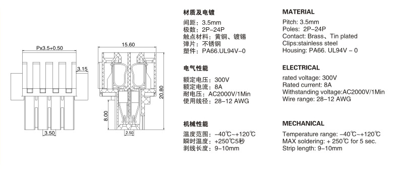 间距:3.5mm;极数:2P-24P;额定电压/电流:300V/8A
