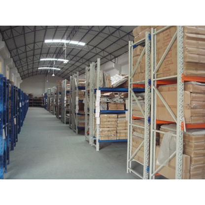 采用三向叉车,巷道宽度1.4-1.7m.库房空间利用率高.窄巷道式货架的通道仅比托盘稍宽,继承了重型货架对托盘存储布局无严格要求的特点,能充分利用仓库面积和高度,具有中等存储密度。但是窄巷道式货架需用特殊的叉车或起重机进行存取作业,同时还需要其他搬运机械配套,周转时间相比传统的货架较长。由于货架不仅有储存托盘的功能,还需有支撑和加固搬运设备的功能,因此对结构强度和公差配合要求极为严格,必须综合考虑,精确设计、安装。窄巷道式货架也可以同时集成货物暂存平台,大幅度提高存储效率