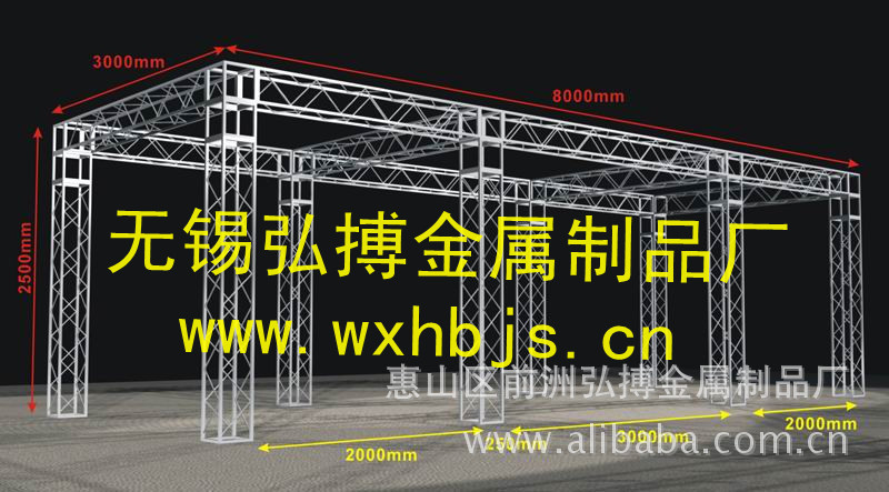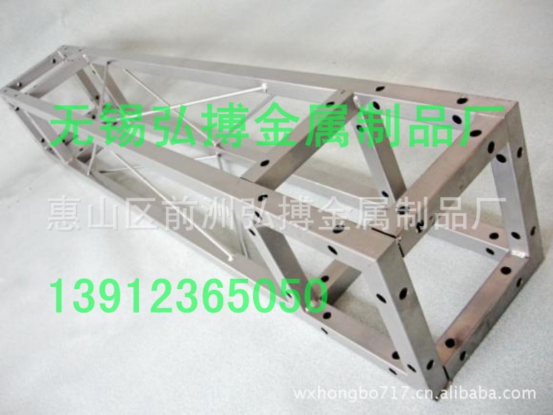 一:钢铁桁架:200mm*200mm,250mm*250mm的方管钢铁桁架,有镀锌,喷漆(红,黑,蓝)喷塑等3种式样,且我公司生产的方管桁架为加强型桁架,自带接头、五面连接,不需要另外配接头,解决了安装繁琐,接头不易损坏等问题,一般20规格桁架为小桁架,安全跨度为8米,25规格桁架安全跨度为12米。