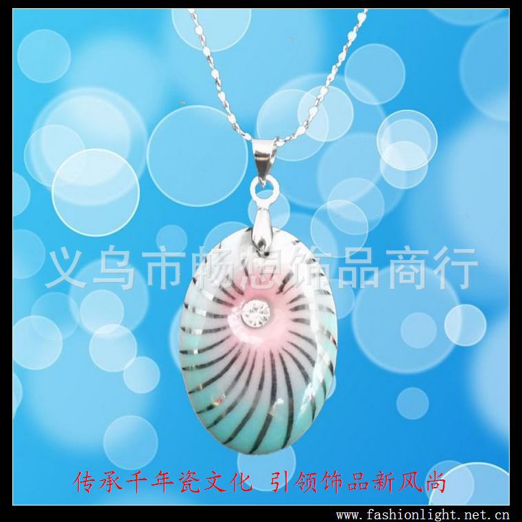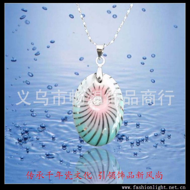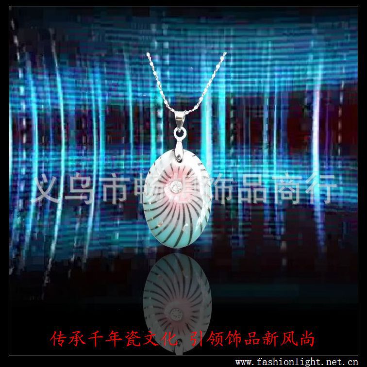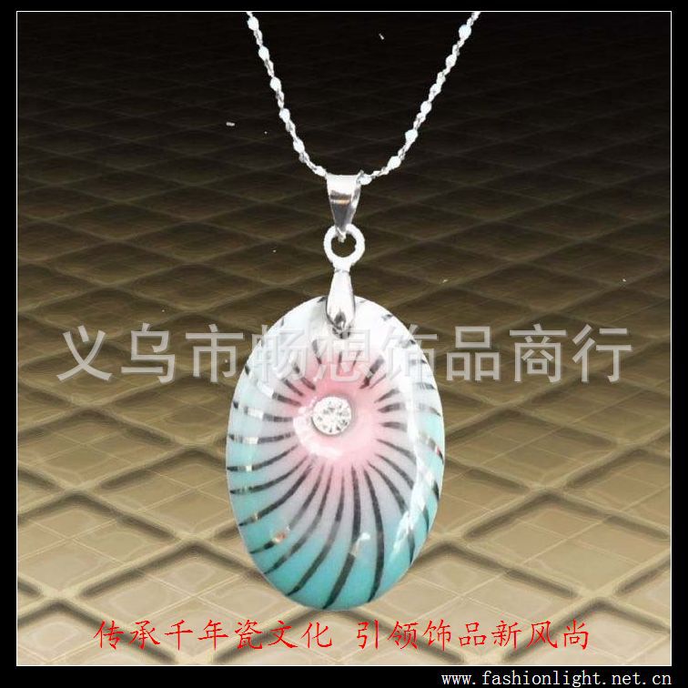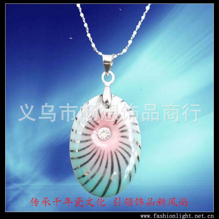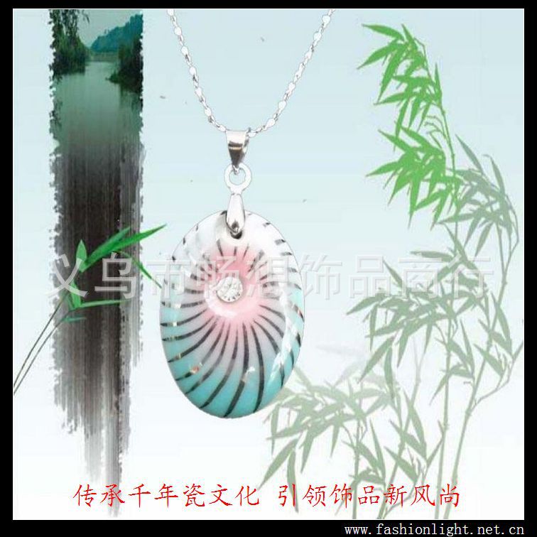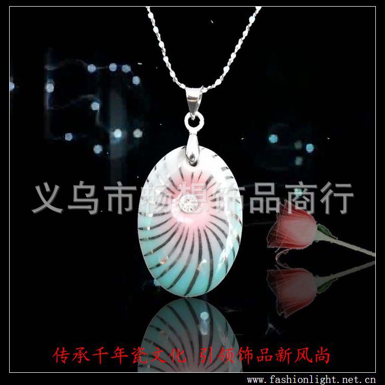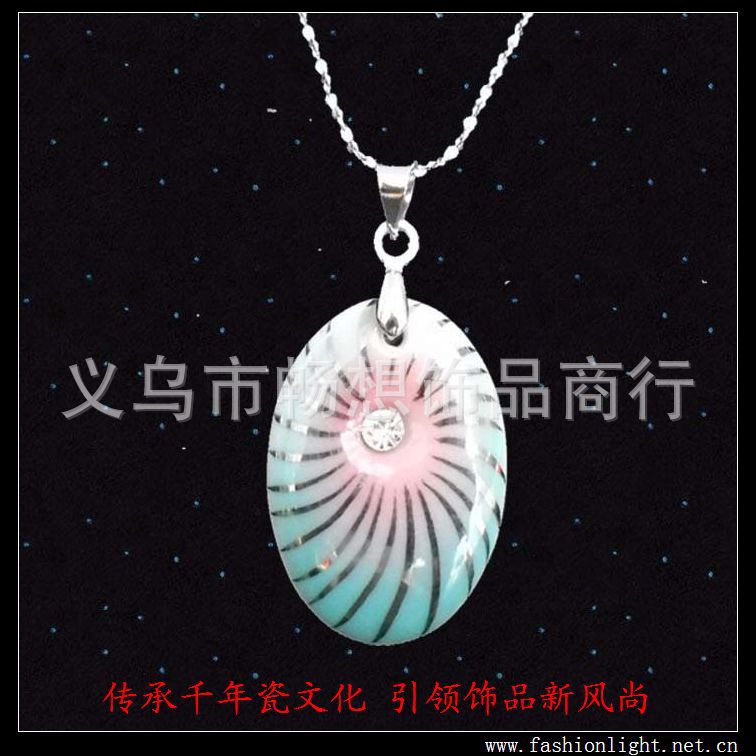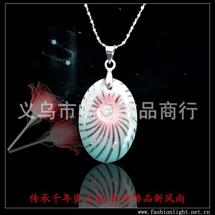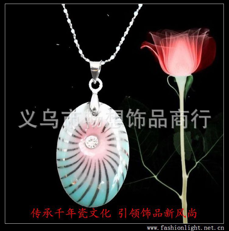 产品名称 | 时尚之光陶瓷饰品 | 链子材质及长度 | 925银(40CM长) | 坠子材质 | 陶瓷 | 坠子尺寸 | 21*20MM | 工艺技术 | 喷彩工艺+描金工艺+镶钻 | 包装及规格 | 礼品盒(17.5*12*3.4MM)+手提袋(有图片) |
