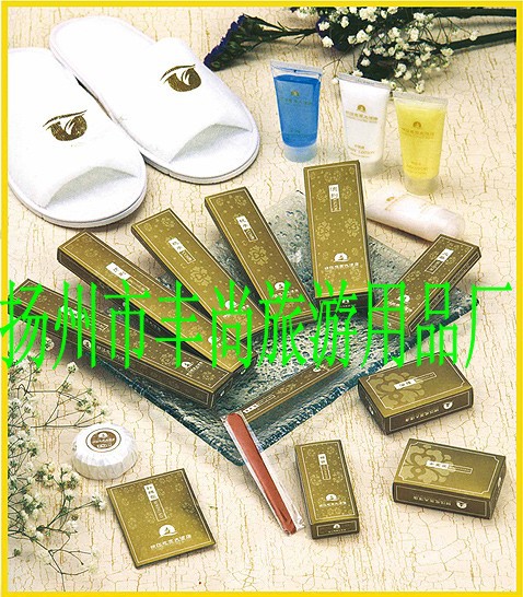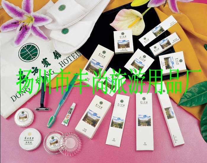 客房一次性牙具、香皂、梳子、洗发液、淋浴液、护发素、润肤露、拖鞋、浴帽、擦鞋器、针线包、袋泡茶、圆珠笔、夹纸笔、剃须刀、棉签、指甲锉、口杯垫、吸水杯垫、杯盖、火柴、洗衣袋、礼品袋、垃圾袋、托盘、垃圾桶、服务指南、调酒棒、标牌,棉织品有面巾、方巾、浴巾、地巾、床罩、床单、被子、被套、枕芯、枕套、护床垫等。‘‘(酒店、宾馆、酒店、旅游度假休闲、大堂大厦饭店、商务会所、快捷酒店、等一次性洗漱用品套装专卖)’’