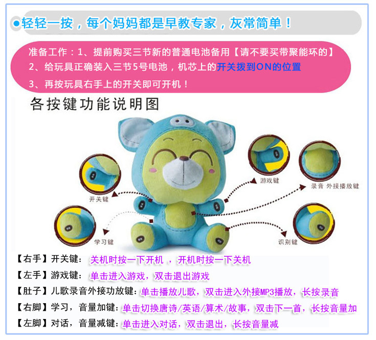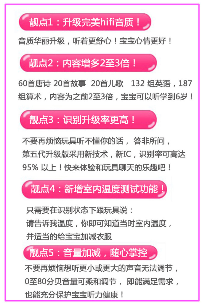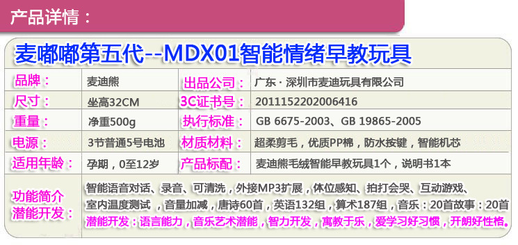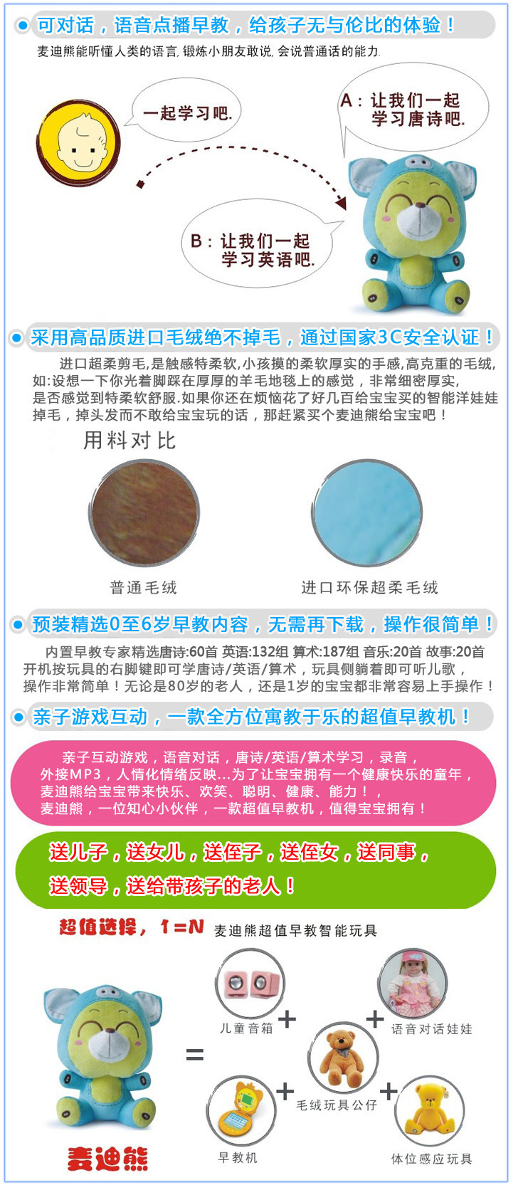 第五代升级版麦兔兔或麦嘟嘟功能简介:【两款,一款粉色,一款蓝色】 坐高32CM,重量约0.5KG,智能语音对话、可以录音、可拆洗,外接MP3扩展、体位感知、拍打会哭、互动游戏、唐诗:60首 英语:132组 算术:187组 音乐:20首 故事:20首 新增靓点1:升级完美hifi音质! 靓点2:早教内容增多2至3倍 靓点3:识别升级率更高 靓点4:新增室内温度测试 靓点5:音量加减