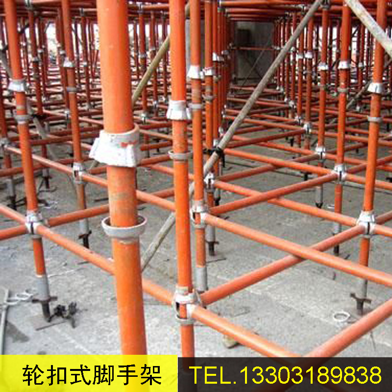 轮扣式脚手架是新型的一种便捷式支撑脚手架,它有点类似碗扣架又优于碗扣架,其主要特点是:1、具有可靠的双向自锁能力;2、无任何活动零件;3、运输、储存、搭设、拆除方便快捷;4、受力性能合理;5、可以自由调节;6、产品标准化包装;7、组装合理,它的安全性、稳定性好于碗扣式、优于门式脚手架;8、实践中表明,作为梁跨度在15m以内,净空层高度在12m一下的单跨、多跨连续梁、框架结构房屋模板支撑体系,其稳定性和安全性好于碗扣式脚手架,优于门式脚手架。缺点: 1、轮扣式脚手架搭设不宜在基层不硬实,地面不平整和不进行混 凝土硬化的地面上;2、不宜直接在土质差的软土层、地面易塌陷的地基上搭设;3、只能作为落地式脚手架使用,不能作为悬挑脚手架使用。施工要点:1、前期应做好支撑体系的专项施工方案设计,并由总包单位放线定位,使支撑体系横平竖直,以保证后期剪刀撑和整体连杆的设置,确保其整体稳定性和抗倾覆性。2、轮扣式脚手架安装基础必须要夯实平整并采取混凝土硬化措施。3、轮扣式脚手架宜使用同一标高的梁板底板的标高范围,对于高度和跨度较大的单一构件支承架使用时对横杆进行拉力和立杆轴向压力(临界力)的验算,确保架体的稳定性和安全性。4、架体搭设完成后要加设足够的剪刀撑,在顶托与架体横杆300-500mm之间的距离要增设足够的水平拉杆,使其整体稳定性得到可靠的保证;5、目前我国建设部未有轮扣式脚手架行业标准和规范出台,不过在建设工地上已开始广泛使用,当然希望相关部门制定出相应的规范,使轮扣式脚手架在工程中正确的使用有可靠的依据。
