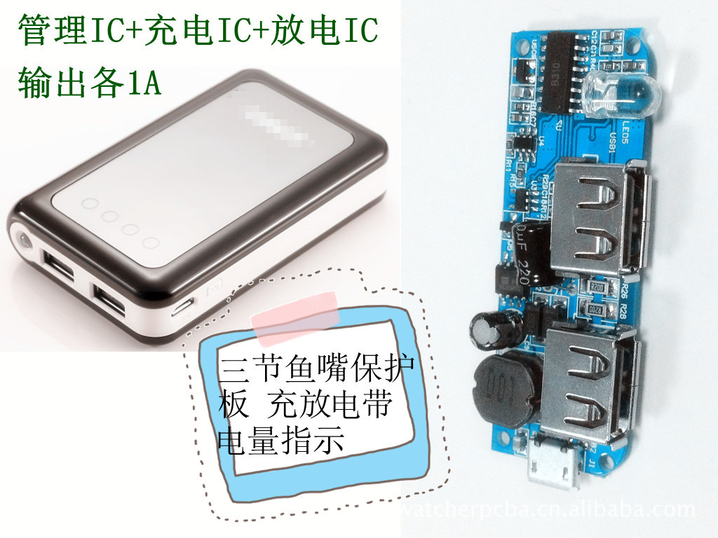 双USB输出移动电源PCBA 外壳 外形尺寸:97*62*23MM 电池容量:装3个18650电芯 输入:5V/1A 输出:5V/1A和5V/.5A 电量显示:4个LED灯指示 照明:高亮手电筒 深圳守望者专业设计生产PCBA,本公司所有方案均产用现代品牌IC,采用多年自主研发的程序。 针对公模,本公司提供市场上流行的软件+硬件双重保护方案,让你在高稳定性能的基础上做出超优势价格的产品。 |